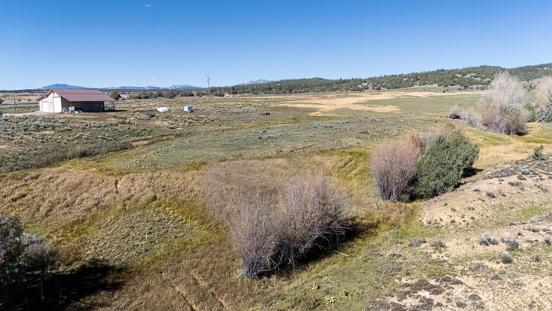 A newer metal barn with electric and water is the singular improvement on the property. There is a water right and stock pond that serves livestock and wildlife alike. Elk and mule deer are routine visitors, allowing hunting with a camera, rifle, or bow. The property is enrolled in the Elk Private Lands Use System (EPLUS) program with its sister property across the highway. In the event of the separation of the two properties, El Barranco East’s new owners would need to enroll in the EPLUS program as a new entity. Due to its location and attributes, the property has several potential uses.